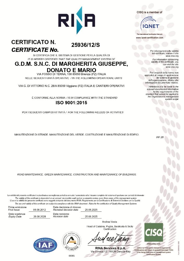 È importante mantenere un Sistema di Gestione Integrato per fornire ai propri clienti una maggiore certezza della capacità di controllo dei propri processi produttivi, per rispondere in modo efficace ed efficiente alle loro esigenze e per tutti gli aspetti impliciti ed espliciti in conformità alle politiche aziendali. GDM si impegna a tradurre i principi previsti promuovendo l’applicazione del Sistema di Gestione integrato, in linea con gli standard europei ed internazionali, curando una formazione generale e continua e la sensibilizzazione del proprio management e di tutto il personale sulle tematiche ambientali, di sicurezza e di qualità. L’organizzazione si propone di documentare periodicamente il Sistema aziendale, al fine di dimostrare l’attuazione delle procedure organizzative e delle istruzioni operative necessarie a garantire il servizio offerto.